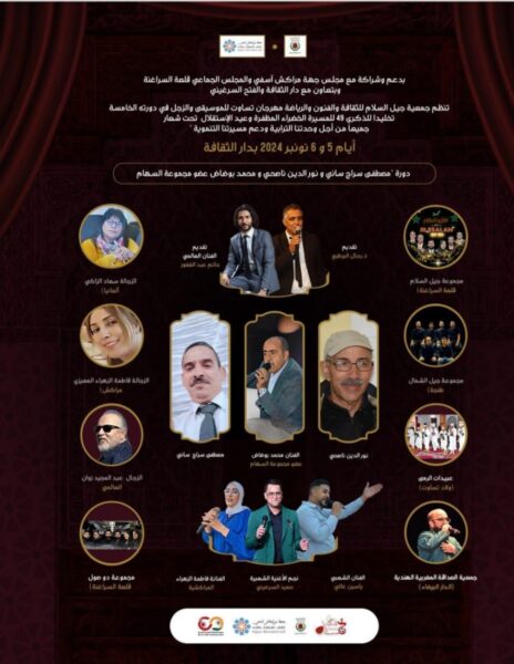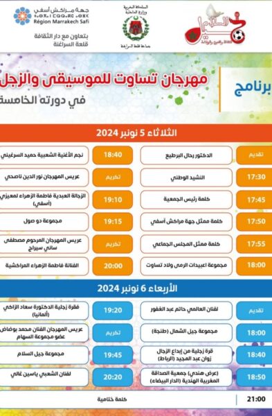تنظم جمعية جيل السلام للثقافة والفنون والرياضة مهرجان تساوت للموسيقى والزجل في دورته الخامسة تخليدا للذكرى 49 للمسيرة الخضراء المظفرة وعيد الإستقلال تحت شعار ” جميعاً من أجل وحدتنا الترابية ودعم مسيرتنا التنموية” أيام 5 و 6 نونبر 2024 بدار الثقافة هذه دورة تخلد روح الراحل مصطفى سراج ساني و تكريما للكل من نور الدين ناصحي و محمد بوضاض عضو مجموعة السهام وذلكبدعم وشراكة مع مجلس جهة مراكش آسفي والمجلس الجماعي قلعة السراغنة وبتعاون مع دار الثقافة قلعة السراغنة والفتح الرياضي السرغيني لكرة القدم 11.