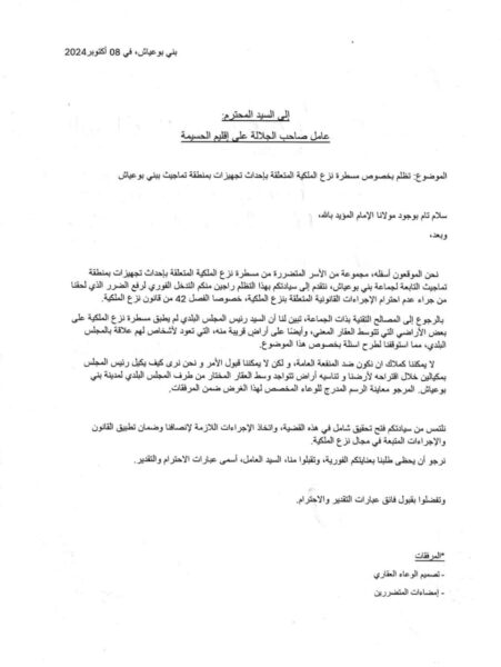 واكد.المتضررون في شكايتهم على التمسك المطلق بحقهم في استرجاع أراضيهم، مشيرين إلى استعدادهم للجوء إلى مختلف المؤسسات الوطنية الممثلة للجالية المغربية المقيمة بالخارج، للمطالبة بحقوقهم وحماية ممتلكاتهم، ملتمسين من السلطات الإقليمية التفاعل الإيجابي مع هذه الشكايات والتدخل لفتح تحقيق في الموضوع والعمل على تطبيق القانون بكل شفافية وعدالة.