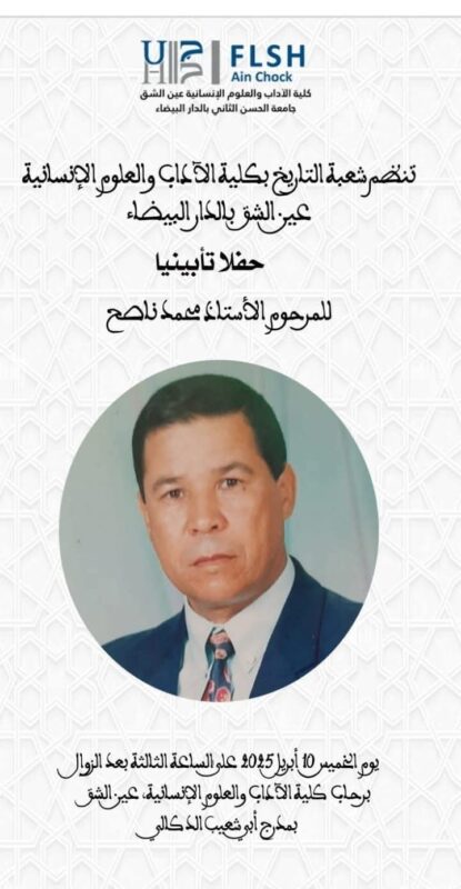 تنظم شعبة التاريخ بكلية الآداب والعلوم الإنسانية عين الشق بالدار البيضاء، حفلا تأبينيا للمرحوم الأستاذ محمد ناصح، وذلك يوم الخميس 10 أبريل على الساعة الثالثة بعد الزوال برحاب كلية الآداب والعلوم الإنسانية عين الشق بمدرج ابي شعيب الدكالي.