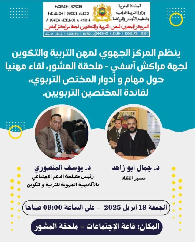 في إطار الرؤية الاستراتيجية للإصلاح 2015 – 2030، وارتباطاً بالأوراش التربوية المفتوحة للرفع من مردودية التكوين وتحسين جودته، وجعل الطالب (ة) محورا مركزيا لكل التدابير المتخذة، وتفعيلا لأحكام القانون الإطار رقم 17-15 المتعلق بمنظومة التربية والتكوين والبحث العلمي، وخاصة تلك المرتبطة ب “الارتقاء بالحياة المدرسية”، وفي سياق تفعيل الأنشطة المندمجة بسلك تكوين المختصين التربويين والمختصين الاجتماعيين ومختصي الاقتصاد والادارة لسنة 2025، ينظم المركز الجهوي لمهن التربية والتكوين لجهة مراكش – آسفي – ملحقة المشور بمراكش، لقاءا ممهننا في موضوع : مهام وأدوار المختص التربوي لفائدة المختصين التربويين،وذلك يوم الجمعة 18 أبريل 2025، بملحقة المشور، مراكش.