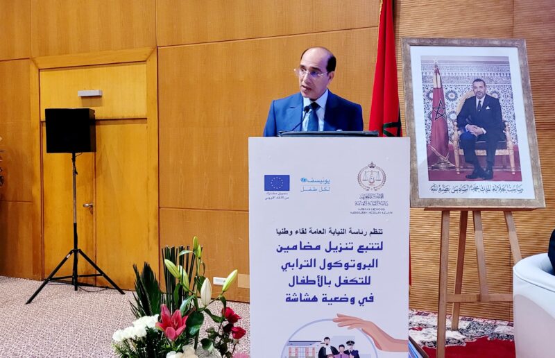 يذكر أن “البروتوكول الترابي للتكفل بالأطفال في وضعية هشاشة” قدم تم توقيعه يوم 27 ماي 2024، بالرباط، الذي صادف تخليد اليوم الوطني للطفل ، وذلك من طرف رئاسة النيابة العامة، والقطاعات الحكومية التالية: وزارة التضامن والإدماج الاجتماعي والأسرة، وزارة الشباب والثقافة والتواصل، ووزارة التربية الوطنية والتعليم الأولي والرياضة، وزارة الصحة والحماية الاجتماعية، وزارة الإدماج الاقتصادي والمقاولة الصغرى والتشغيل والكفاءات، بدعم من منظمة الأمم المتحدة للطفولة –اليونيسيف- وبشراكة مع المرصد الوطني لحقوق الطفل والاتحاد الوطني لنساء المغرب.