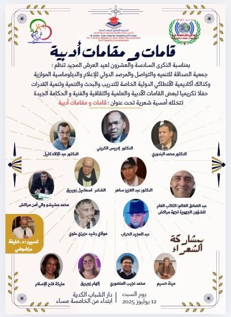 بمناسبة الذكرى التاسعة والخمسين لعيد العرش المجيد، تنظم جمعية الصداقة للتنمية والتواصل والمرصد الدولي للإعلام والدبلوماسية الموازية، وبشراكة مع أكاديمية الانطلاقة الدولية الخاصة بالتدريب والبحث وتنمية المهارات، أمسية أدبية تحت عنوان: “قامات ومقامات أدبية”.