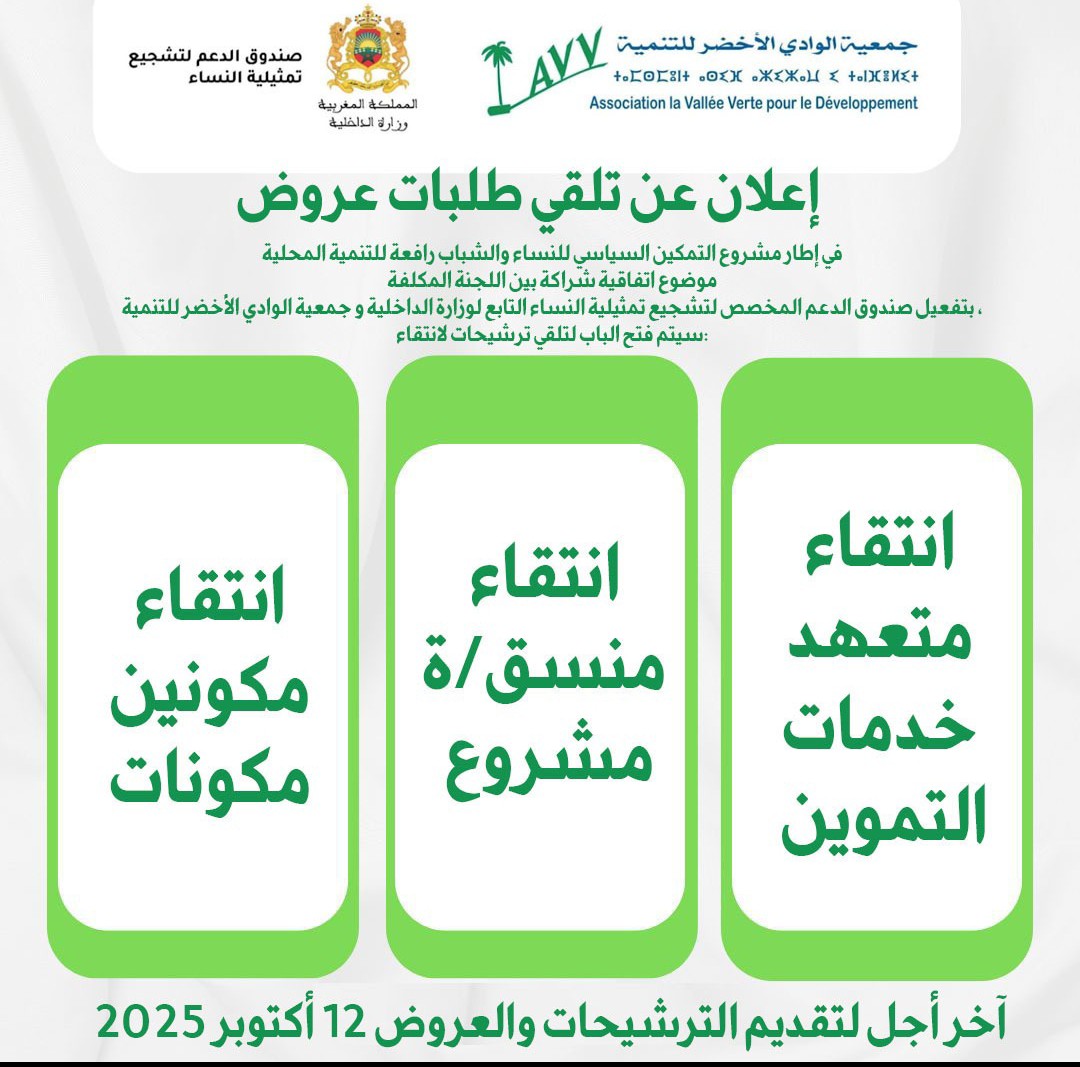 أعلنت جمعية الوادي الأخضر للتنمية عن فتح باب تلقي الترشيحات الخاصة بعمليتي انتقاء مموني خدمات التموين، وانتقاء مكونين، وذلك في إطار تنفيذ مشروع “التمكين السياسي للنساء والشباب رافعة للتنمية المحلية”.