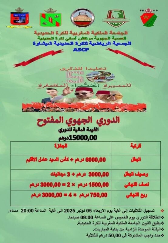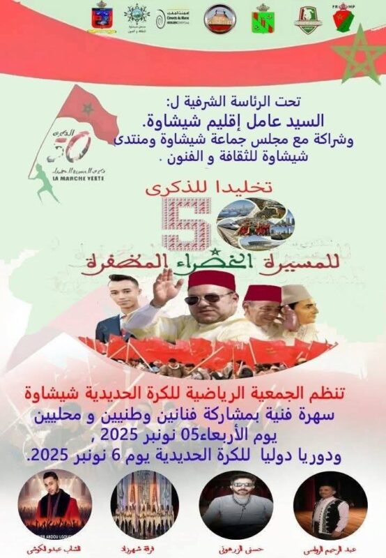 بمناسبة الذكرى ال50 للمسيرة الخضراء، وتحت الرئاسة الشرفية لعامل إقليم شيشاوة، وبشراكة مع مجلس جماعة شيشاوة ومنتدى شيشاوة للثقافة والفنون، تستضيف مدينة شيشاوة حدثا رياضيا وثقافيا متميزا خلال يومي 05 و 06 نونبر 2025، حيث تنظم الجمعية الرياضية للكرة الحديدية بشيشاوة سهرة فنية كبرى، بمشاركة نخبة من الفنانين الوطنيين والمحليين، ضمن منافسات “الدوري الجهوي المفتوح” للكرة الحديدية، الذي يحمل هذا العام طابعًا خاصًا يتجاوز الإطار الرياضي المعتاد.