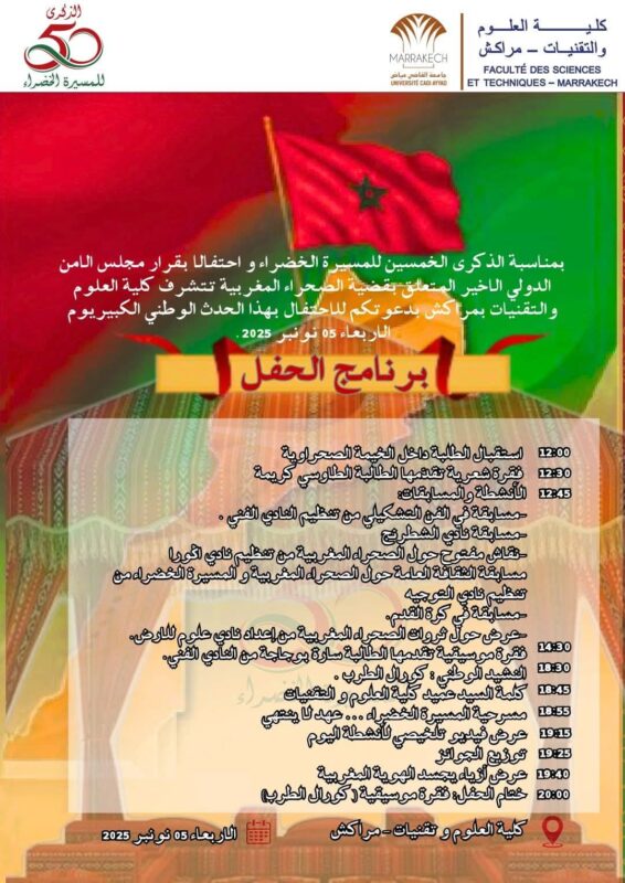 انطلقت، يوم الأربعاء، بكلية العلوم والتقنيات التابعة لجامعة القاضي عياض بمراكش، فعاليات الاحتفاء بالذكرى الخمسين لانطلاق المسيرة الخضراء المظفرة، في أجواء يسودها الاعتزاز والفخر بهذا الحدث التاريخي الذي أعاد رسم ملامح الوحدة الوطنية ورسّخ ارتباط الشعب المغربي بأقاليمه الجنوبية.