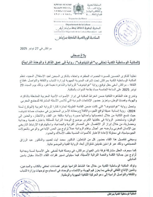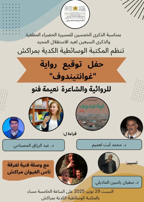 تخليداً للذكرى الخمسين للمسيرة الخضراء المظفرة، واحتفاء بالذكرى السبعين لعيد الاستقلال المجيد، تنظم المكتبة الوسائطية الكدية بمراكش تحت إشراف المديرية الجهوية لوزارة الشباب والثقافة والتواصل -قطاع الثقافة – مراكش أسفي حفل توقيع رواية “غواتيندوف” للروائية والشاعرة نعيمة فنو، وذلك يوم السبت 29 نونبر 2025 على الساعة الخامسة مساءً بقاعة الندوات بالمكتبة.