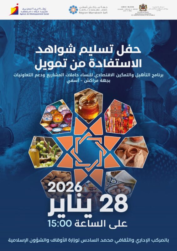 تنظم وكالة التنمية الاجتماعية، بشراكة مع جهة مراكش آسفي ووزارة التضامن والإدماج الاجتماعي والأسرة، يوم 28 يناير 2026 على الساعة الثالثة بعد الزوال، حفل تسليم شواهد الاستفادة من التمويل لفائدة النساء حاملات المشاريع والتعاونيات النسائية، وذلك بالمركب الإداري والثقافي محمد السادس التابع لوزارة الأوقاف والشؤون الإسلامية. ويأتي هذا الحدث في إطار الجهود الرامية إلى تعزيز الإدماج الاقتصادي للنساء ودعم المبادرات النسائية المساهمة في التنمية المحلية والاقتصاد الاجتماعي والتضامني.