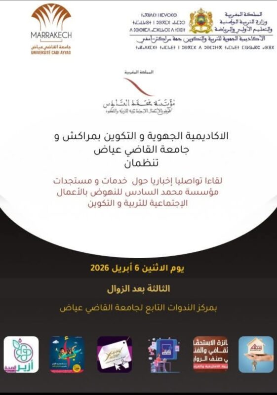 تستعد مدينة مراكش لاحتضان لقاء تواصلي وإخباري حول خدمات ومستجدات مؤسسة محمد السادس للنهوض بالأعمال الاجتماعية للتربية والتكوين، وذلك يوم الاثنين 6 أبريل 2026، ابتدا ءً من الساعة الثالثة بعد الزوال بمركز الندوات التابع لجامعة القاضي عياض.