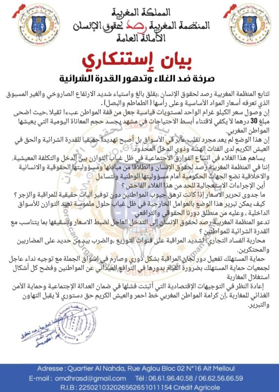 أعربت المنظمة المغربية لحقوق الإنسان “رصد” عن قلقها المتزايد إزاء الارتفاع اللافت في أسعار المواد الأساسية، خاصة الخضر مثل الطماطم والبصل، مؤكدة أن هذا الوضع بات يؤثر بشكل مباشر على القدرة الشرائية للمواطنين، ويزيد من معاناة الفئات ذات الدخل المحدود.