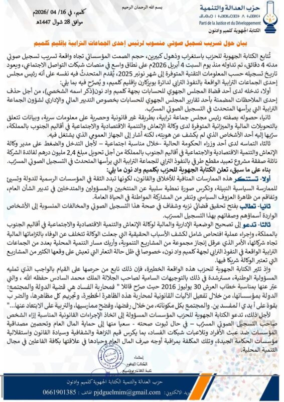 تُتابع الكتابة الجهوية للحزب باستغراب وذهول كبيرين، حجم الصمت المؤسساتي تجاه واقعة تسريب تسجيل صوتي مدته 4 دقائق، تم تداوله منذ يوم السبت 4 أبريل 2026م على نطاق واسع في منصات شبكات التواصل الاجتماعي، ويعود تاريخ تسجيله حسب المعلومات التقنية المتوفرة إلى شهر نونبر 2025، يُقدم المتحدثُ فيه نفسه على أنه رئيس مجلس إحدى الجماعات الترابية الواقعة بالنفوذ الترابي لدائرة بويزكارن بإقليم كلميم، و يُصرِّح فيه بما يلي: