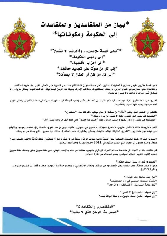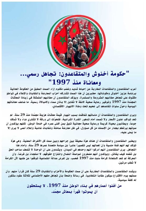 ويشدد المتقاعدون والمتقاعدات المغاربة على أن صمت الحكومة والأحزاب والنقابات 29 سنة كان قراراً منهم، وأن صمتهم يوم الاقتراع سيكون عقاباً انتخابياً، في رسالة واضحة بأن تجاهل ملفهم الاجتماعي لثلاثة عقود ستكون له كلفة سياسية.